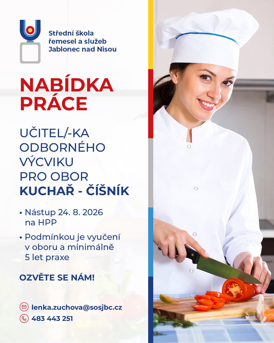 Střední škola řemesel a služeb přijme učitele odborného výcviku pro obor Kuchař – číšník. Jedná se o práci s žáky, vedení odborného výcviku v moderně vybaveném školním pracovišti a přípravu budoucích profesionálů v gastronomii.